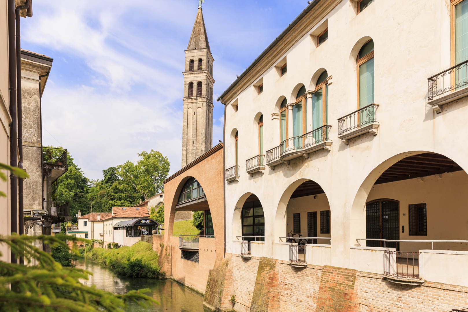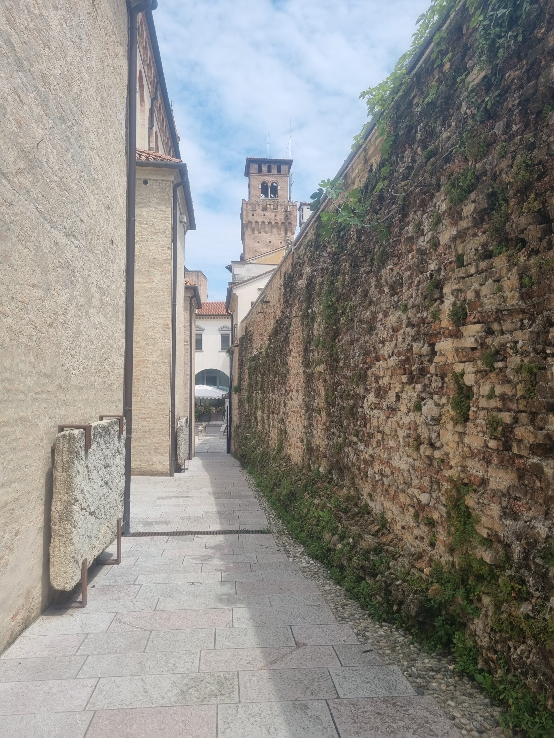 In Calle Monsignor Visintin, tra il ramo interno del Monticano ed il centro, si riconosce bene la fortificazione costruita attorno all’anno 1000. Alte, spesse e con fossato, le mura circondavano il castello e sono visibili affianco della parete sinistra del Duomo; seguendone il tragitto, si nota che si congiungono alla base del Campanile, che in realtà non è altro che una delle torri medievali da cui partì la creazione della Torre campanaria.