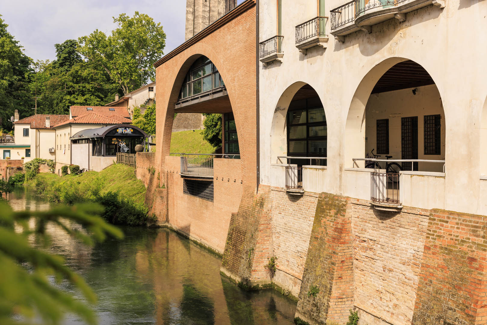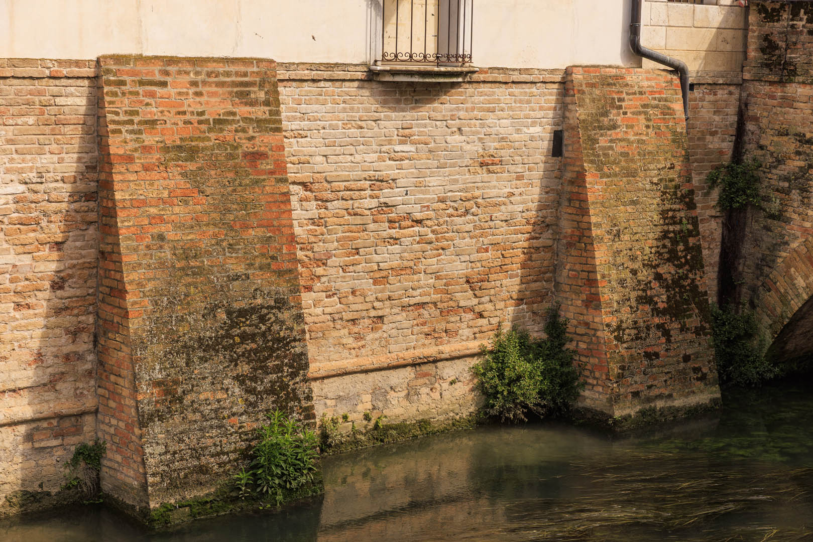 In direzione opposta, per un tratto spariscono e lasciano spazio ad una costruzione imponente, posta in gran parte sopra al ramo interno del Monticano; ricompaiono poi, massicce e tondeggianti, a creare un quadrilatero che lascia immaginare le dimensioni originarie. Le mura medievali si confondono poi con altre costruzioni, ma si possono notare le diverse stratificazioni.
